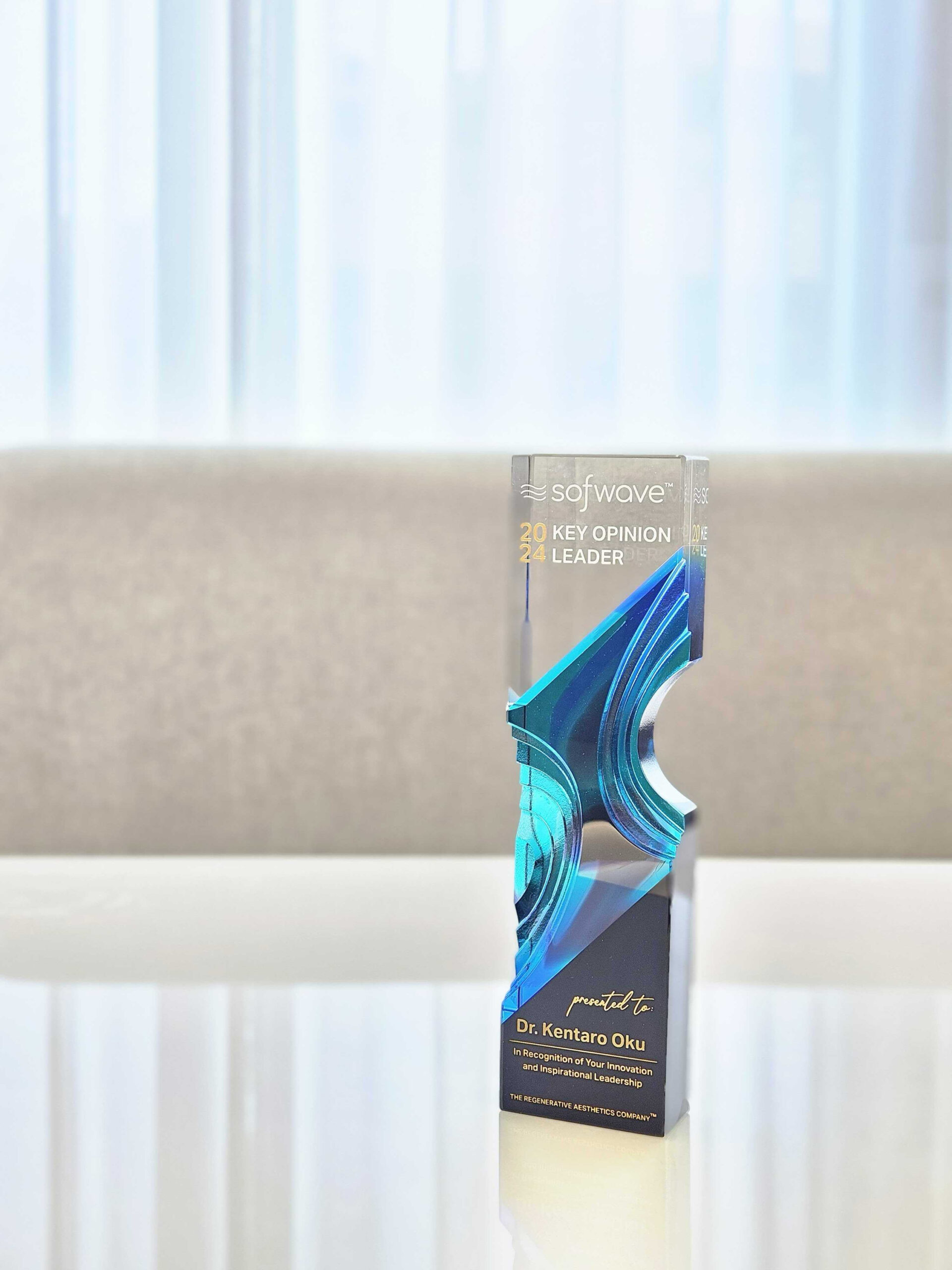 今回、新たな治療法としてのThermal-Thread Technique®(サーマルスレッド法)の開発、ならびに毛穴・小じわ・ニキビ痕等への肌質改善治療の開発が海外からも注目され、クリスタルの盾を頂きました。